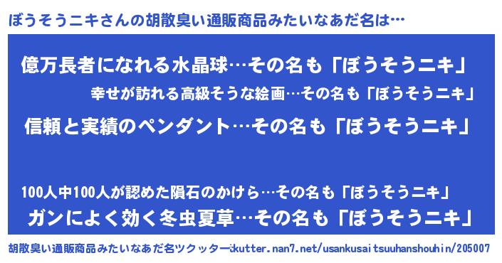 | 意味不明あだ名 | 『とにかく怪しいぼうそうニキ』 |