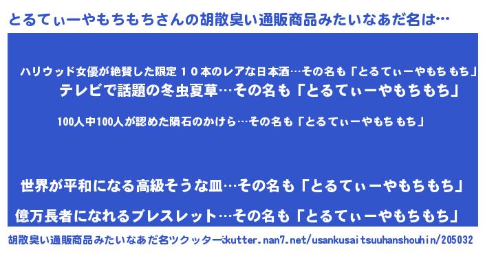 | 男性向けラノベタイトル風あだ名 | 『はたらくとるてぃーやもちもちさま!』 |