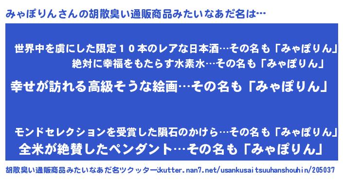 | 男性向けラノベタイトル風あだ名 | 『やはりみゃぽりんの青春ラブコメはまちがっている 』 |