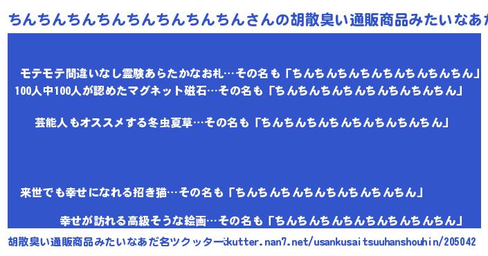 | 男性向けラノベタイトル風あだ名 | 『Re:ちんちんちんちんちんちんちんちんから始める異世界生活』 |