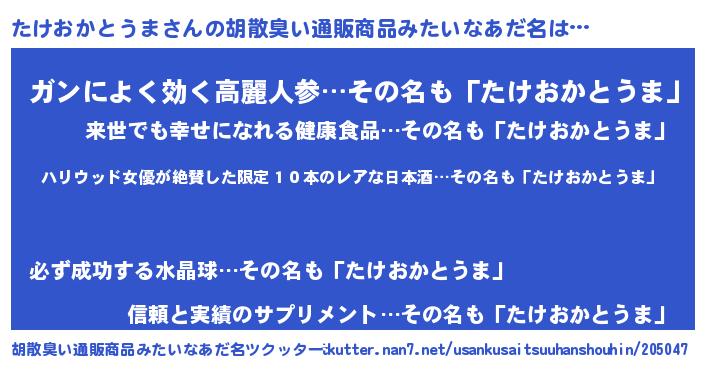 | 意味不明あだ名 | 『住所不定無職たけおかとうま(41歳)』 |