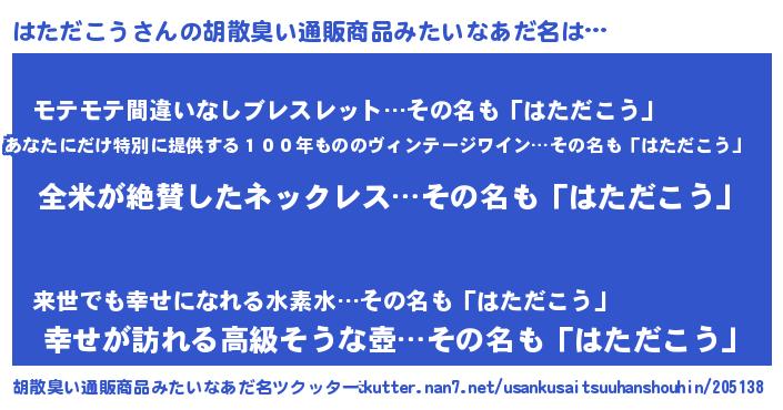 | 男性向けラノベタイトル風あだ名 | 『はただこうの嫁は女の子じゃないと思った?』 |
