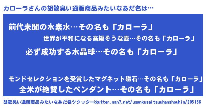 | 意味不明あだ名 | 『ペロリンカローラ』『永久保存カローラ』 |