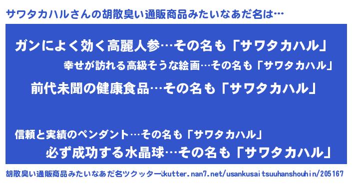 | 意味不明あだ名 | 『永久保存サワタカハル』 |