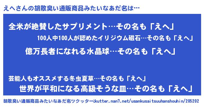 | ヘコむあだ名 | 『えへにゅー』『えへお』『なまこ酢』 |