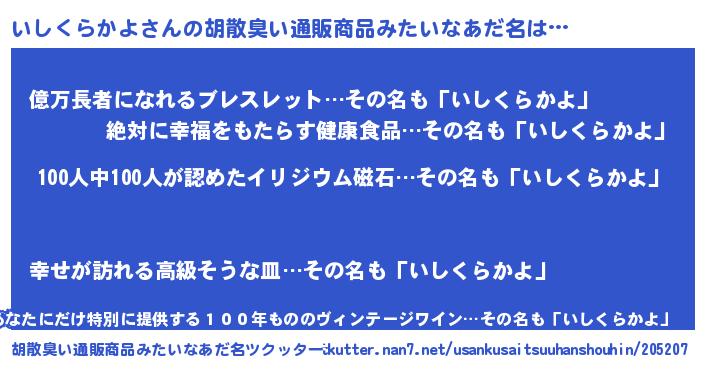 | ヘコむあだ名 | 『いしにゅー』『いしくらかよ(爆)』 |