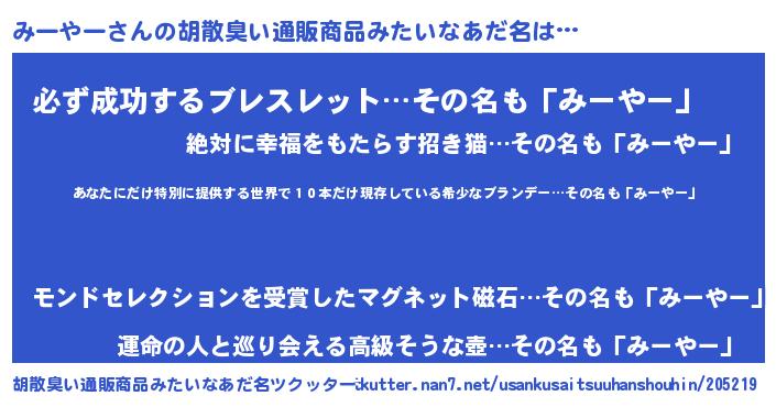 | 意味不明あだ名 | 『住所不定無職みーやー(95歳)』 |