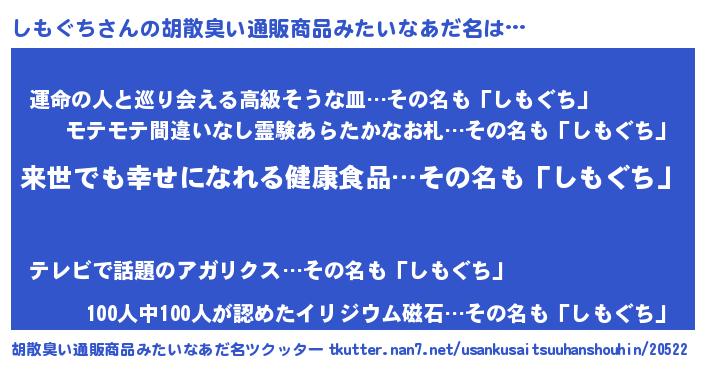 | ヘコむあだ名 | 『しもぐち(爆)』『酢こんぶ』 |