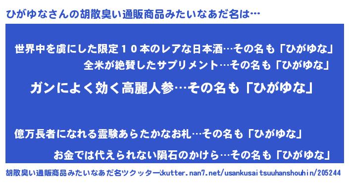 | 意味不明あだ名 | 『自称ひがゆな』『めかぶ科ひがゆな属』 |