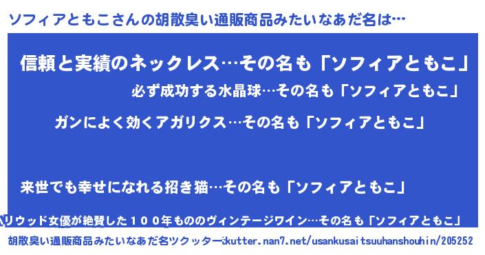 | 男性向けラノベタイトル風あだ名 | 『ソフィアトモコスレイヤー』 |