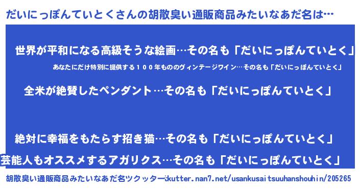 | 意味不明あだ名 | 『とにかく怪しいだいにっぽんていとく』 |
