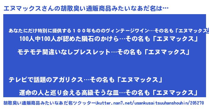 | 男性向けラノベタイトル風あだ名 | 『エヌマックスに滅ぼされるだけの簡単なお仕事です』 |