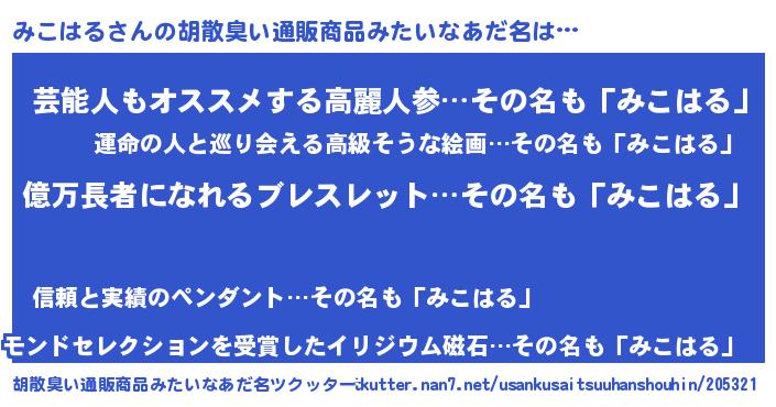 | 意味不明あだ名 | 『ペロリンみこはる』『自称みこはる』 |