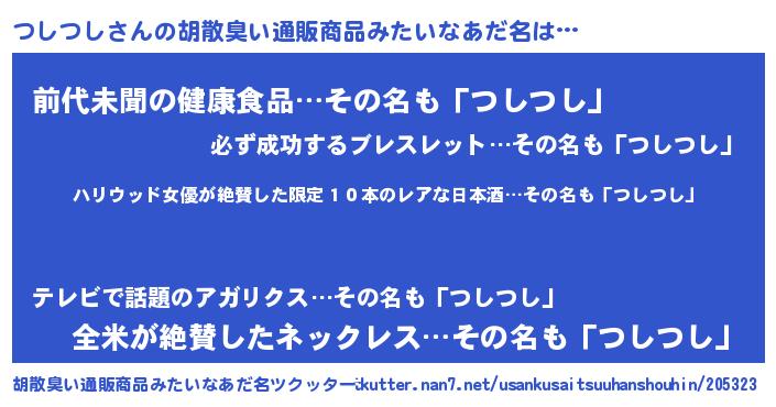 | 意味不明あだ名 | 『住所不定無職つしつし(41歳)』 |