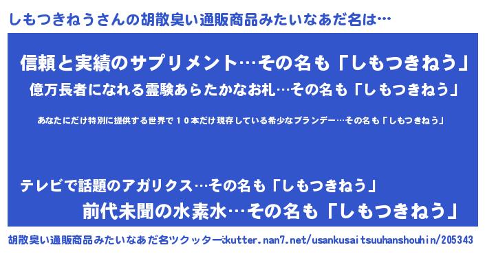 | 意味不明あだ名 | 『住所不定無職しもつきねう(71歳)』 |