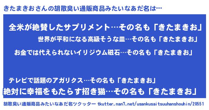 | 男性向けラノベタイトル風あだ名 | 『きたまきおに滅ぼされるだけの簡単なお仕事です』 |