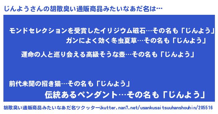 | 男性向けラノベタイトル風あだ名 | 『じんよう~年齢イコール彼女いない歴の魔法使い~』 |