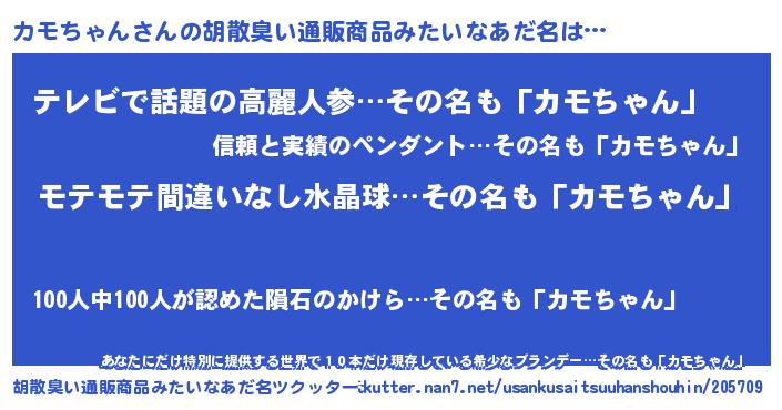 | 男性向けラノベタイトル風あだ名 | 『カモちゃんの憂鬱』 |