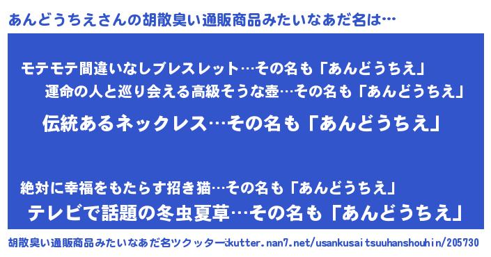 | 欧米人風あだ名 | 『ウサインあんどうちえ』 |