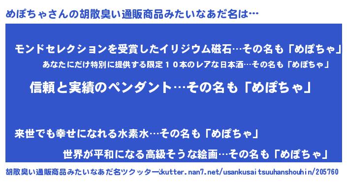 | 恥ずかしいあだ名 | 『メポリンリン』『ボンバーヘッドめぽ』 |