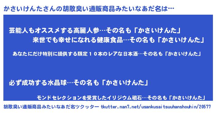 | 意味不明あだ名 | 『住所不定無職かさいけんた(14歳)』 |