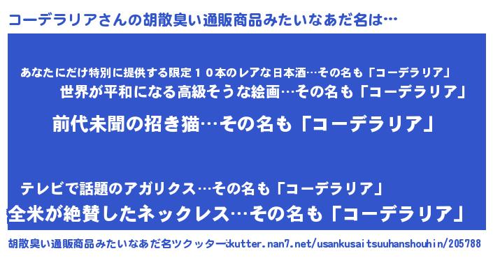 | ヘコむあだ名 | 『コーデラリア(小並感)』『コーっ子』 |