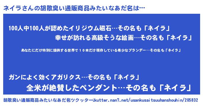 | 意味不明あだ名 | 『住所不定無職ネイラ(71歳)』 |