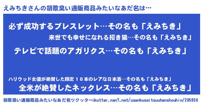 | 意味不明あだ名 | 『自称えみちき』『もやし科えみちき属』 |