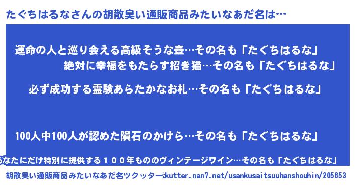| 伝説のあだ名 | 『伝説のスナイパーたぐちはるな』 |