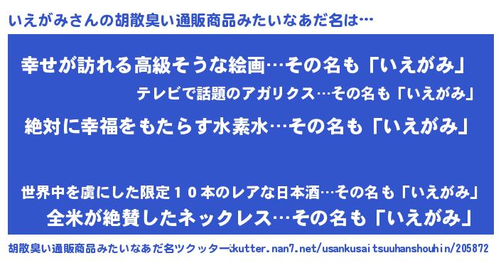 | ヒーロー風カッコイイあだ名 | 『ネオイエガミ』『ウルトラいえがみマン』 |