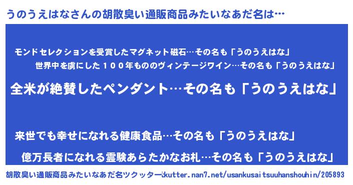 | 男性向けラノベタイトル風あだ名 | 『うのうえはな~年齢イコール彼女いない歴の魔法使い~』 |