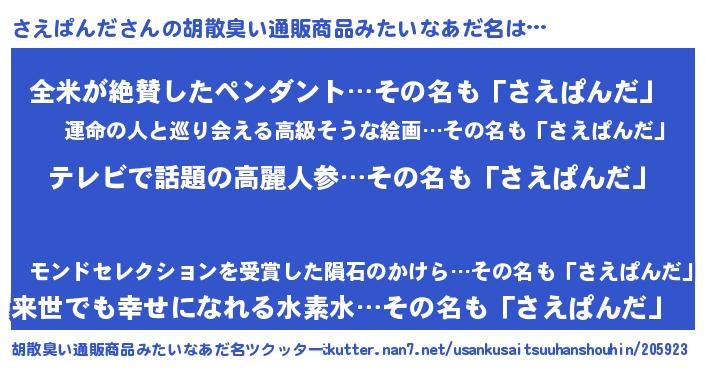 | 意味不明あだ名 | 『自称さえぱんだ』『永久保存さえぱんだ』 |