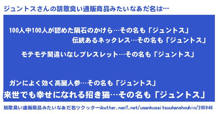 | 男性向けラノベタイトル風あだ名 | 『転生したらジュントスだった件』 |