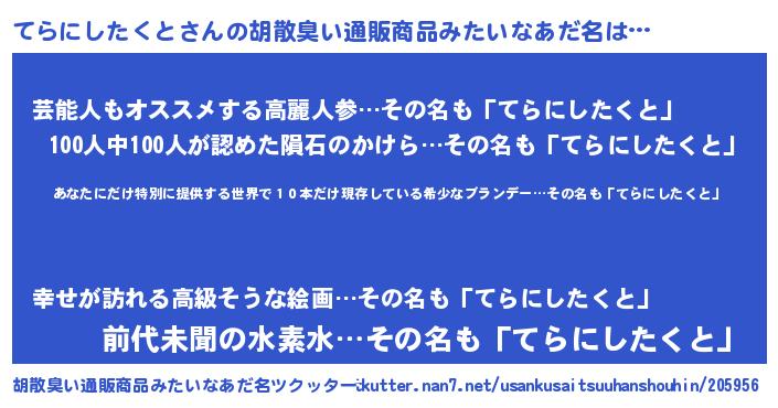| 意味不明あだ名 | 『住所不定無職てらにしたくと(91歳)』 |