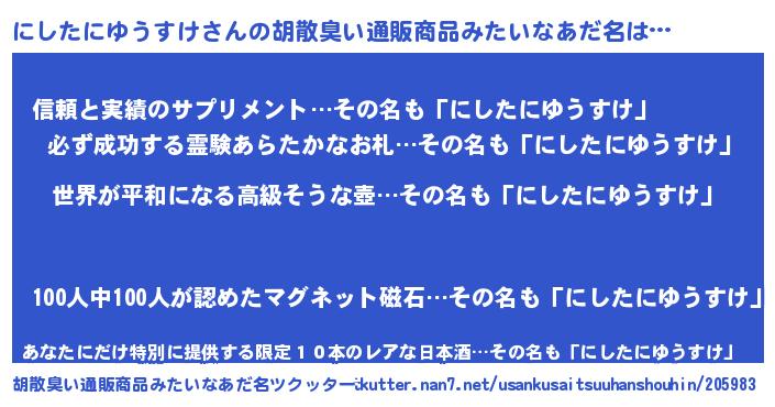 | ヘコむあだ名 | 『なまこ酢』『にしお』『にしにゅー』 |