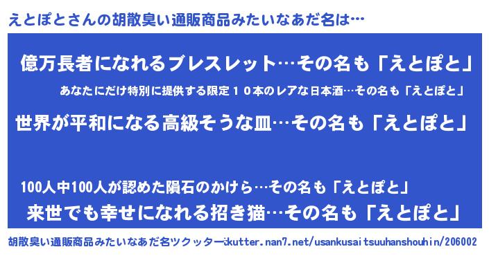えとぽとさんの胡散臭い通販商品みたいなあだ名をツクッター!