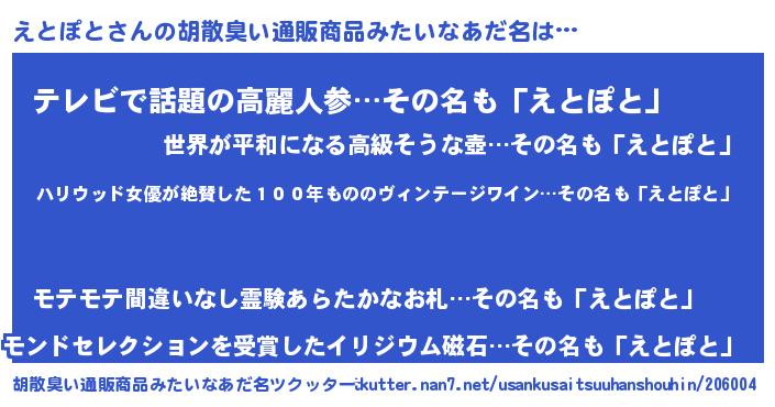 | 意味不明あだ名 | 『住所不定無職えとぽと(9歳)』 |