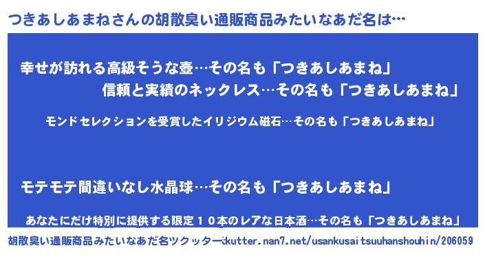 | 男性向けラノベタイトル風あだ名 | 『つきあしあまねに滅ぼされるだけの簡単なお仕事です』 |