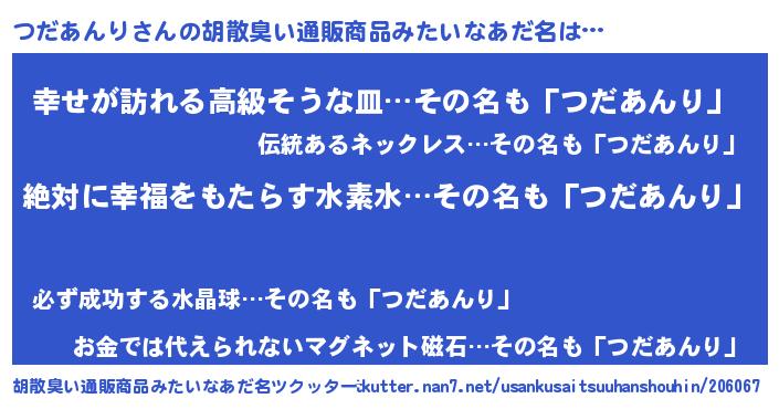 | 女子向けラノベタイトル風あだ名 | 『異世界で失敗しない100のつだあんり』 |