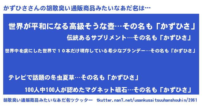 | 男性向けラノベタイトル風あだ名 | 『この素晴らしい世界にかずひさを!』 |