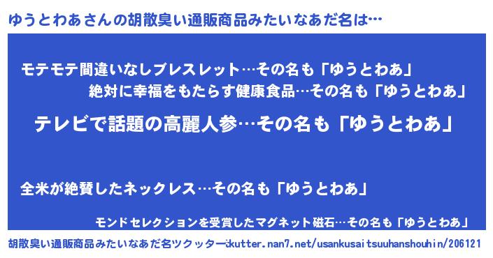 | 意味不明あだ名 | 『自称ゆうとわあ』『ペロリンゆうとわあ』 |