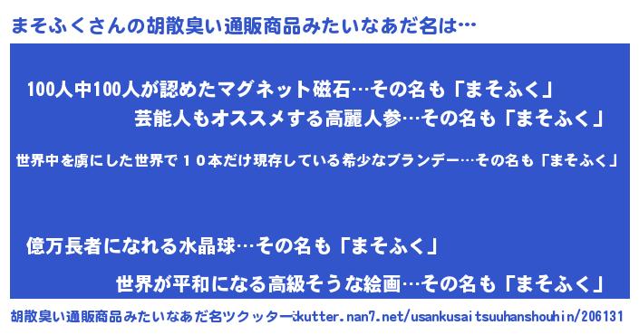 | 意味不明あだ名 | 『住所不定無職まそふく(74歳)』 |