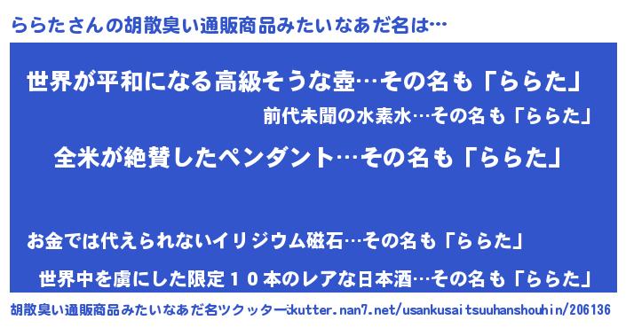 | ヘコむあだ名 | 『ららっちょ』『豆乳』『ららた(笑)』 |
