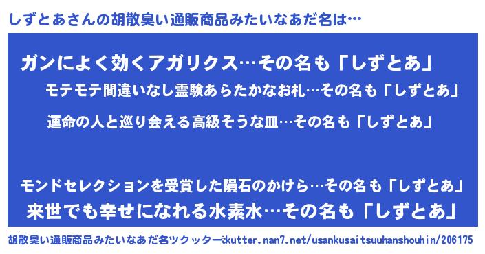 | 意味不明あだ名 | 『ヨモギ科しずとあ属』『自称しずとあ』 |