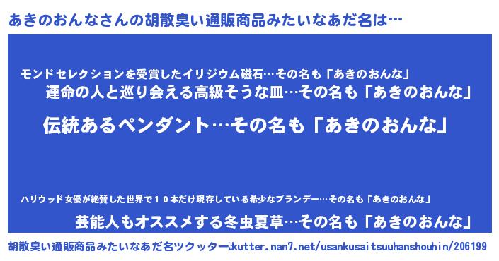 | 男性向けラノベタイトル風あだ名 | 『あきのおんなの嫁は女の子じゃないと思った?』 |