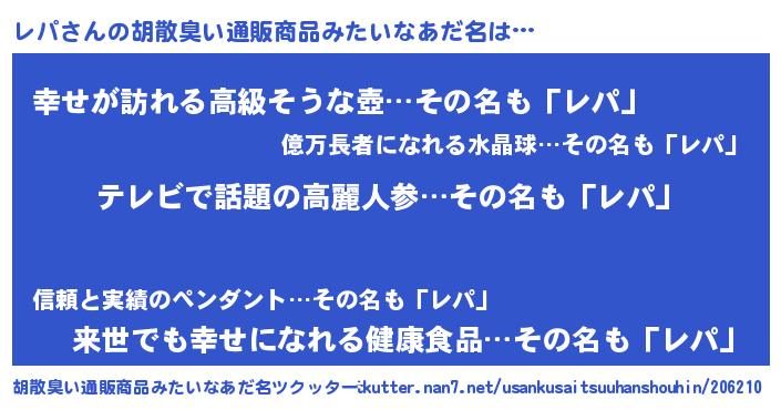 | 男性向けラノベタイトル風あだ名 | 『転生したらレパだった件』『レパの憂鬱』 |