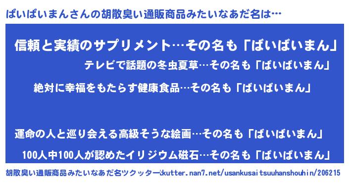 | 男性向けラノベタイトル風あだ名 | 『ばいばいまんという概念が存在しない退屈な世界 』 |