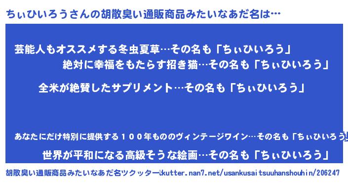 | 意味不明あだ名 | 『とにかく怪しいちぃひいろう』 |