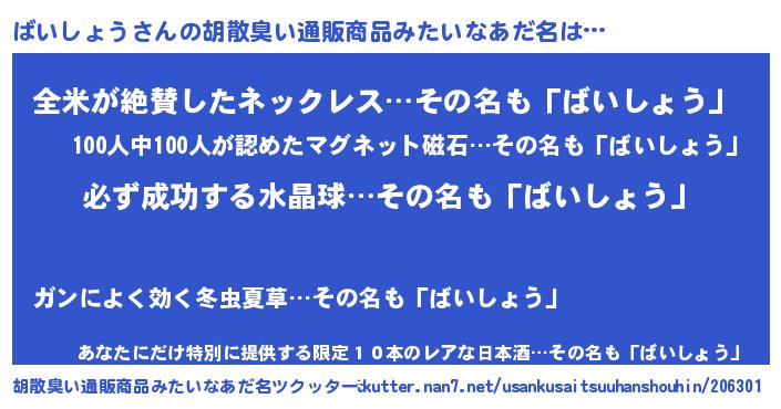 | 意味不明あだ名 | 『ペロリンばいしょう』『自称ばいしょう』 |