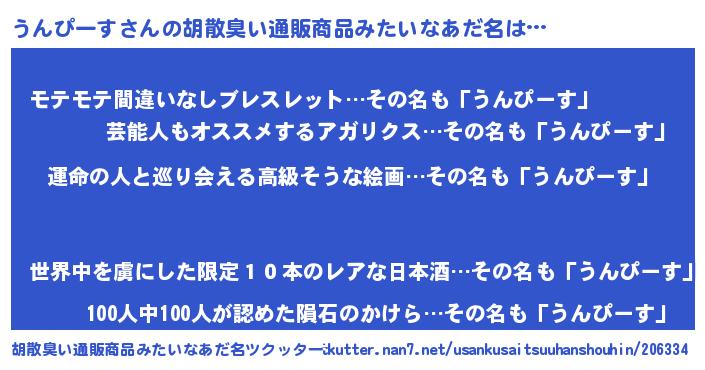 男性向けラノベタイトル風あだ名 | 『うんぴーす~年齢イコール彼女いない歴の魔法使い~』 |